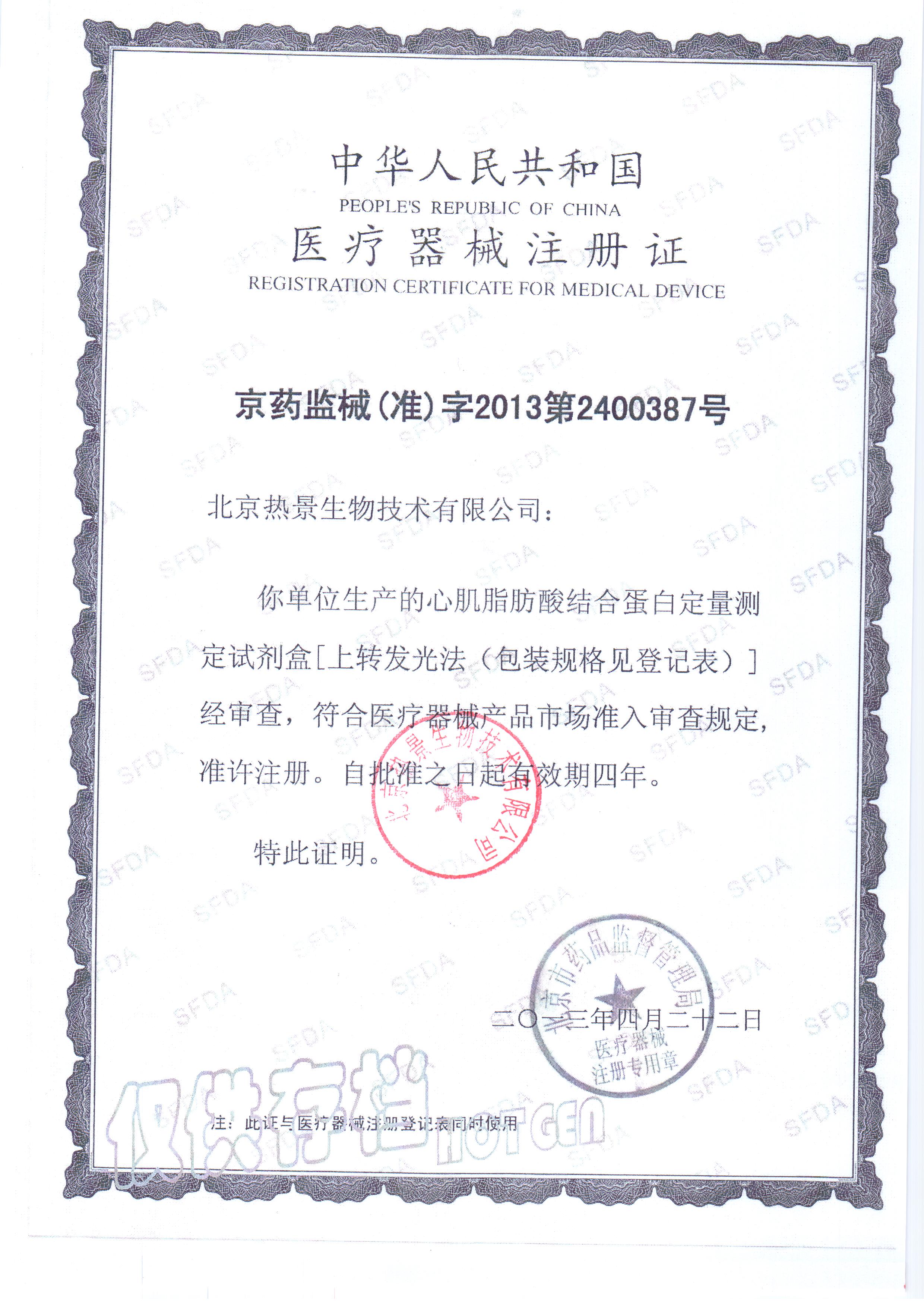 通过多人的共同努力,千亿球友会心肌脂肪酸结合蛋白定量测定试剂盒(上转发光法)获得医疗器械注册证,注册证号:京药监械(准)字2013第2400387号。