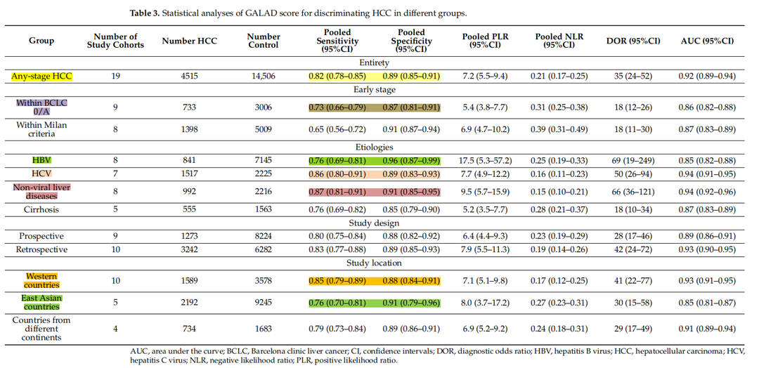 对于识别巴塞罗那临床肝癌分期(BCLC)0/A期HCC,GALAD模型表现出良好的诊断准确性,敏感度为0.73,特异性为0.87。针对不同病因引发的肝癌,GALAD模型在乙肝、丙肝及非病毒性肝病相关的肝癌检测中,其敏感度依次为0.76、0.86和0.87,特异性则为0.96、0.89和0.91。