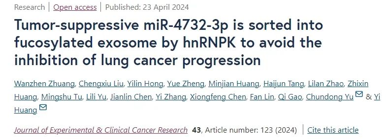 4ÔÂ23ÈÕ£¬¸£½¨Ò½¿Æ´óѧÑо¿ÍŶÓÔÚÆÚ¿¯¡¶Journal of Experimental & Clinical Cancer Research¡·ÉÏ·¢±íÁËÌâΪ¡°Tumor-suppressive miR-4732-3p is sorted into fucosylated exosome by hnRNPK to avoid the inhibition of lung cancer progression¡±µÄÑо¿ÂÛÎÄ£¬±¾Ñо¿Îª·ÇСϸ°û·Î°©ÌṩÁËÒ»¸öÓÐǰ¾°µÄÉúÎï±êÖ¾Î²¢Í¨¹ý°ÐÏòhnRNPK×èÖ¹miR-4732-3p´Ó·ÇСϸ°û·Î°©Ï¸°ûÖС°ÍâÃÚÌåÌÓÒÝ¡±£¬Îª·ÇСϸ°û·Î°©ÖÎÁÆ¿ª±ÙÁËÒ»ÌõеÄ;¾¶¡£ÎÄÕ¹²Í¬×÷Õß°üÀ¨QY-ǧÒÚ(ÇòÓÑ»á)¹Ù·½ÍøÕ¾¸ßçù²©Ê¿¡¢Áõ³ÇÐ㲩ʿ£¬Ç§ÒÚÇòÓÑ»á×÷ΪºÏ×÷µ¥Î»ÎªÑо¿µÄʵʩÌṩÁËÖØÒªÖ§³Ö¡£