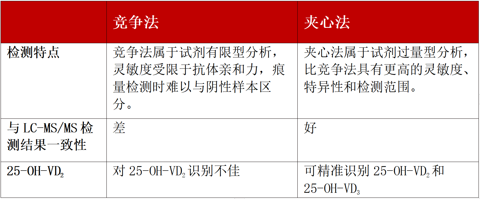 小分子化合物与对应抗体的结合位点多为穴状结构,小分子的大部分结构被覆盖,导致抗体结合空间不足。传统夹心免疫分析技术难以检测小分子,所以市售VD检测试剂盒大多采用竞争法。