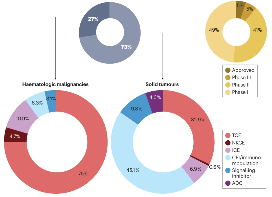 目前,有300多项临床试验涉及200多种不同的双特异性抗体分子,其中约75%用于治疗实体瘤,25%用于治疗血液系统恶性肿瘤。有10种bsAb药物已被批准用于癌症治疗,其中9种在美国和/或欧洲获得批准,cadonilimab在中国获得批准。到目前为止,临床中开发的很大一部分bsAbs已经处于后期阶段(II期和III期)。另外,可以发现,治疗实体瘤的bsAbs主要由免疫调节剂主导,包括双CPI(约45%)和TCE(约33%),其次是靶向双途径、ICEs和ADC的bsAb。