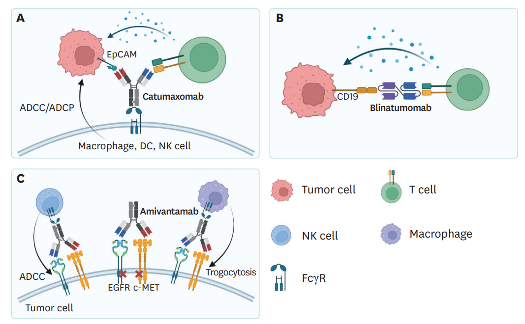 癌症免疫疗法中使用的大多数bsAbs通过T细胞驱动的天然或内源性免疫发挥作用,包括免疫检查点抑制(CPIs)效应细胞接合器(包括TCE和ICEs)以及共刺激性bsAb。