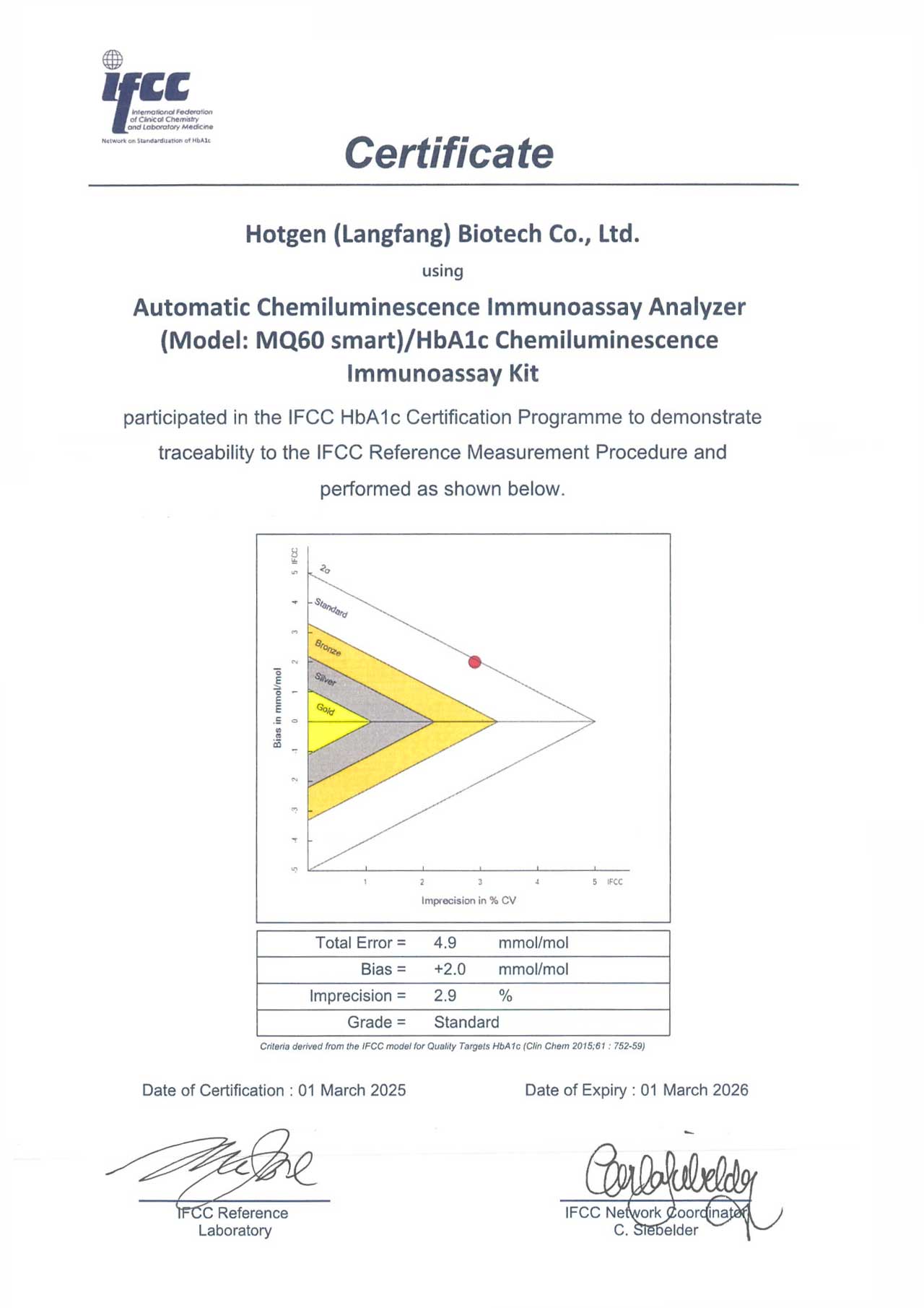 Recently, Hotgen Biotech's mono-test chemiluminescence immunoassay analyzer MQ60 Smart for HbA1c detection has received certification from the International Federation of Clinical Chemistry and Laboratory Medicine (IFCC), ensuring the standardization, normalization, and internationalization of its test results. This also signifies that the HbA1c detection results from MQ60 Smart are internationally recognized for their quality and reliability.Glycosylated Hemoglobin (HbA1c) is currently recognized as the gold standard for assessing long-term blood glucose control in diabetic patients and an important indicator for diabetes screening.