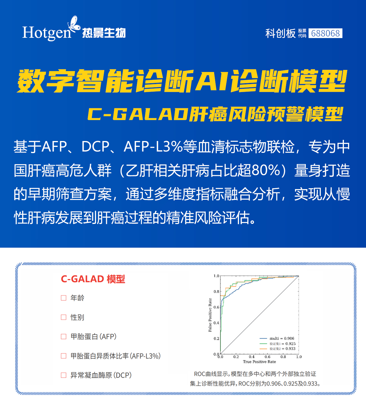 ? ¾«×¼Õï¶Ï£º»ùÓÚÖйúÈËȺÊý¾Ý¿ª·¢µÄC-GALADÄ£ÐÍ£¬ÕûºÏ¶à×éѧÉúÎï±êÖ¾ÎÈçAFP¡¢AFP-L3%¡¢DCPµÈ£©¼°AIËã·¨£¬ÏÔÖøÌáÉý¼«ÔçÆÚ¸Î°©Õï¶ÏÃô¸ÐÐÔºÍÌØÒìÐÔ£¬¸Ã¼¼ÊõÒÑͨ¹ýÖмìԺע²á¼ìÑ飬²¢Óë30Óà¼ÒÈý¼×Ò½Ôº¿ªÕ¹ÁÙ´²ºÏ×÷¡£