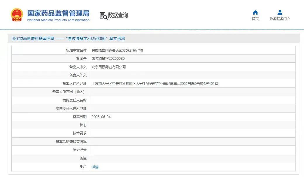 中国北京,2025年6月24日——千亿球友会(股票代码:688068)孵化的北京禹景药业有限公司(以下简称“禹景药业”)自主研发的Akkermansia muciniphila YG2602(AKK YG2602)成功通过国家药品监督管理局化妆品新原料备案(备案号:国妆原备字20250080),成为全球首个获批的AKK菌化妆品新原料。